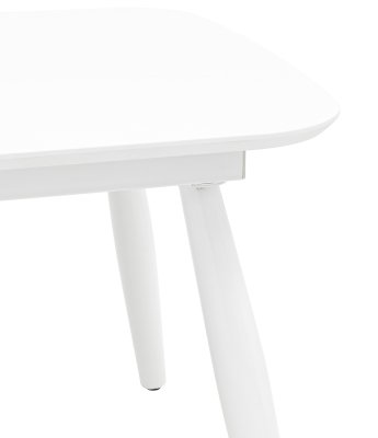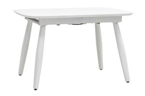 Обеденный стол раскладной. Столешница выполнена из прочного и долговечного МДФ. Светлая глянцевая поверхность столешницы гармонично сочетается с металлическими ножками. Простая прямоугольная форма стола позволит легко вписать его в современный интерьер, стол украсит кухню, гостиную или современное кафе, ресторан. Дополнительная вкладка стола выполнена из МДФ с бумажным шпоном цвета беленого дуба. На вкладке предусмотрена петля для комфортного открытия стола одной рукой.