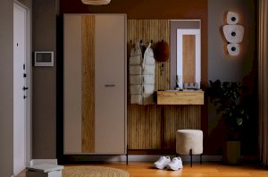 Принт, имитирующий вертикальную фрезеровку придает вешалке уникальный и современный вид, добавляя текстуру и глубину. Материал вешалки – ЛДСП, что обеспечивает прочность и долговечность, а также легкость в уходе.