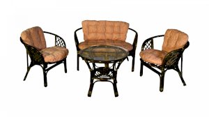 Комплект из натурального ротанга, состоящий из дивана, двух кресел и круглого столика со стеклом.